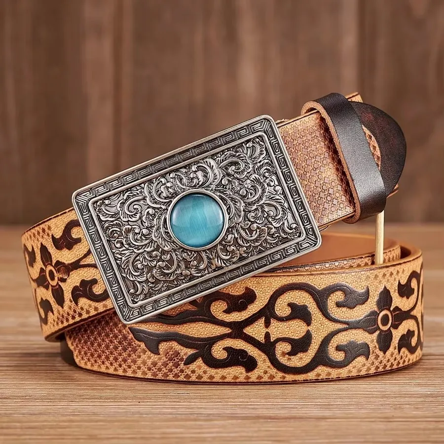 Luxury Handmade Real CowSkin Genine Leather Belts for men, Embossing Wide Cowboy Strap Belt, Metal Unique Buckle belt