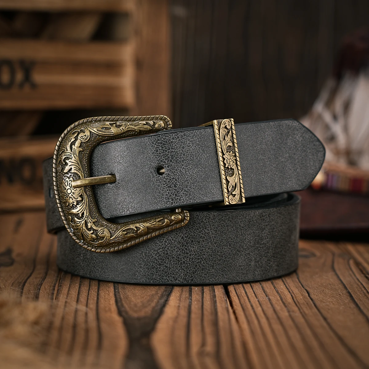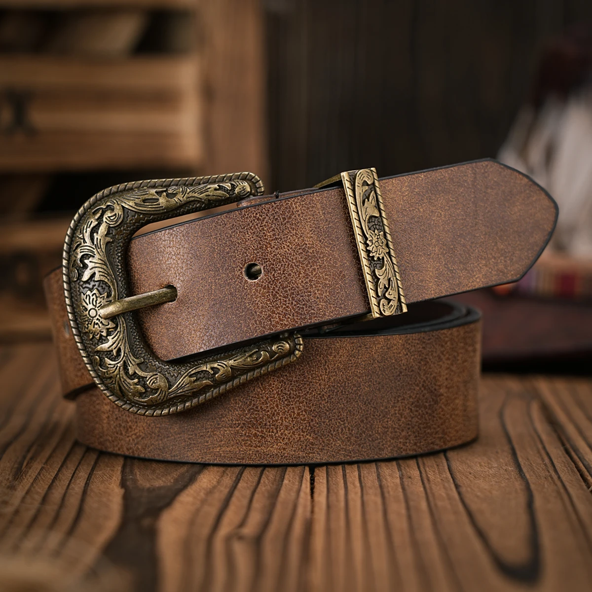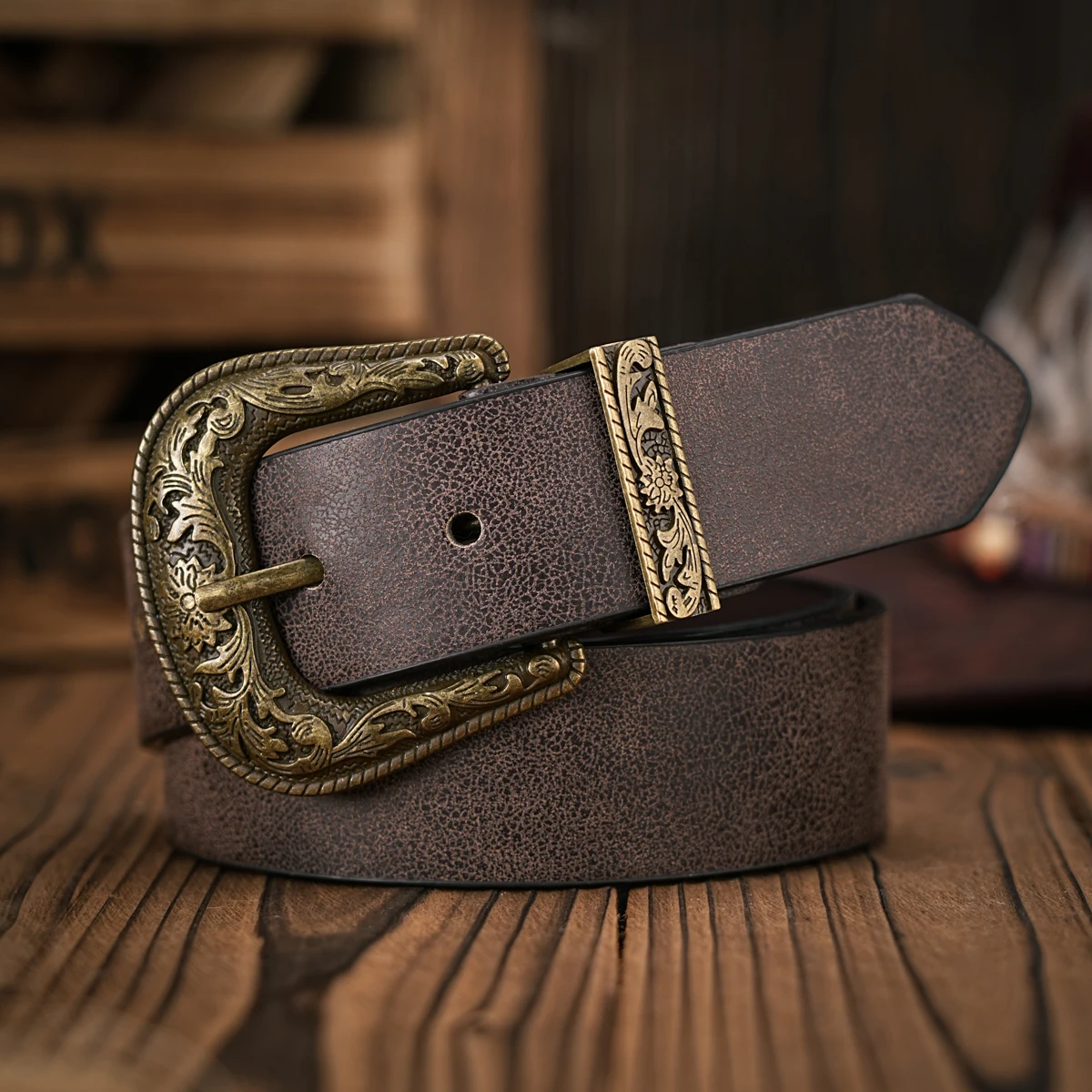 Men – Women – Western Denim – pu leather – Belt – Vintage jeans with floral carved buckle belt