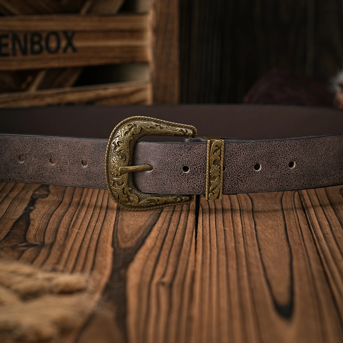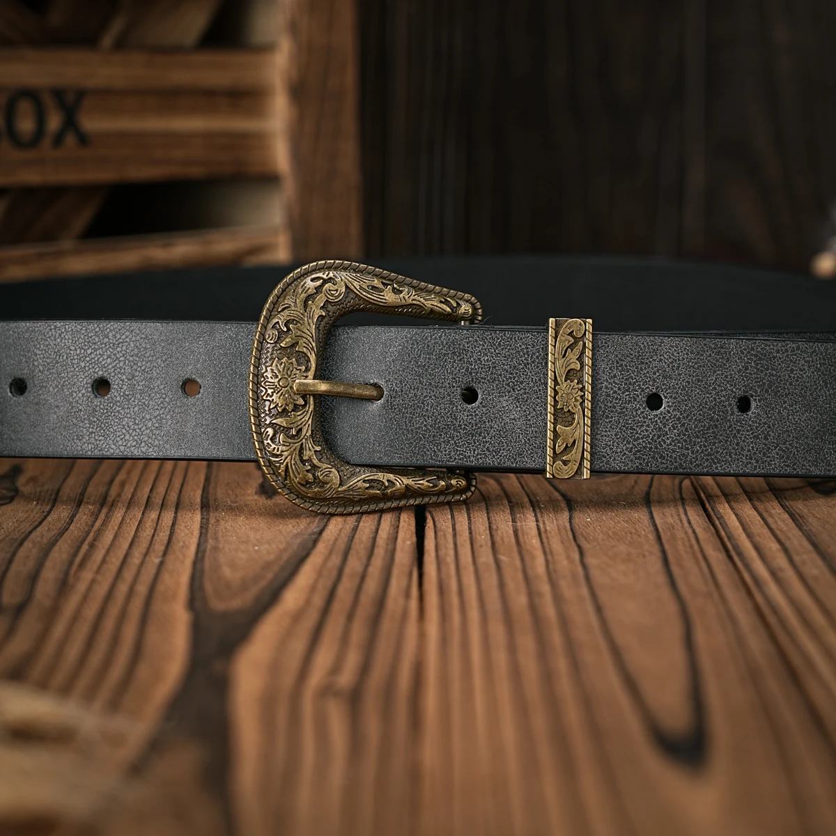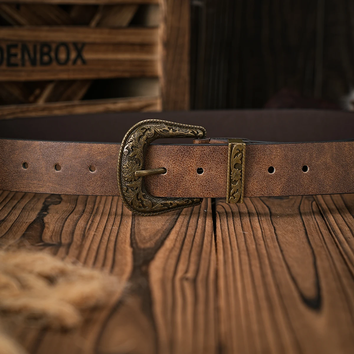 Men – Women – Western Denim – pu leather – Belt – Vintage jeans with floral carved buckle belt